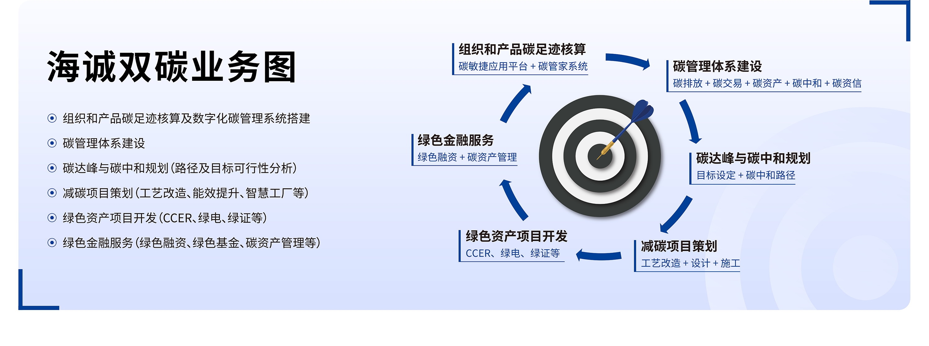双碳科创中心业务涵盖“双碳”咨询(组织和产品碳足迹核算、碳管理体系建设、碳达峰与碳中和规划、减碳项目策划、绿色资产项目开发、绿色金融服务、活动碳中和方案设计等)、绿色专项咨询(中国绿色建筑咨询、LEED/WELL认证、超低能耗建筑咨询、海绵城市设计咨询等)服务,并参编了大量“双碳”领域政策性文件及行业标准文件。