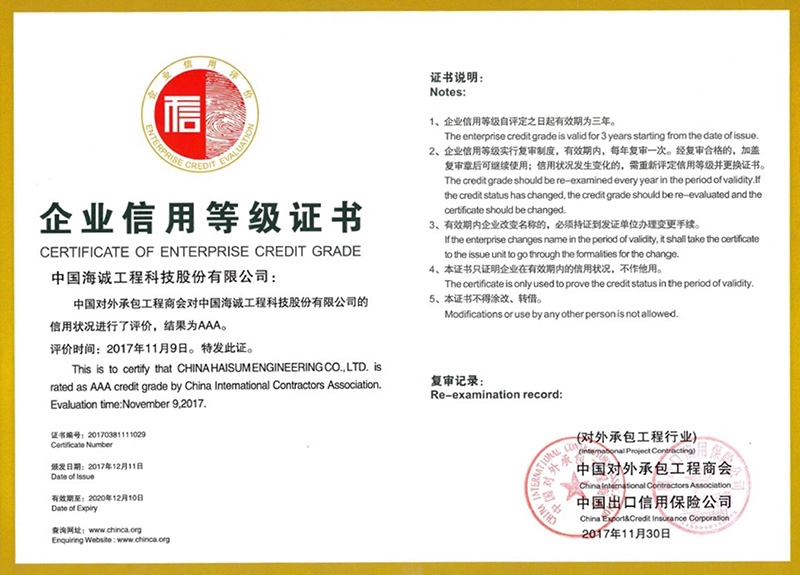 The Company once again won the title “AAA-level Credit Enterprise” in the evaluation of credit ratings of international project contracting enterprises for year 2017 jointly organized by China International Contractors Association and China Export & Credit Insurance Corporation a few days ago.