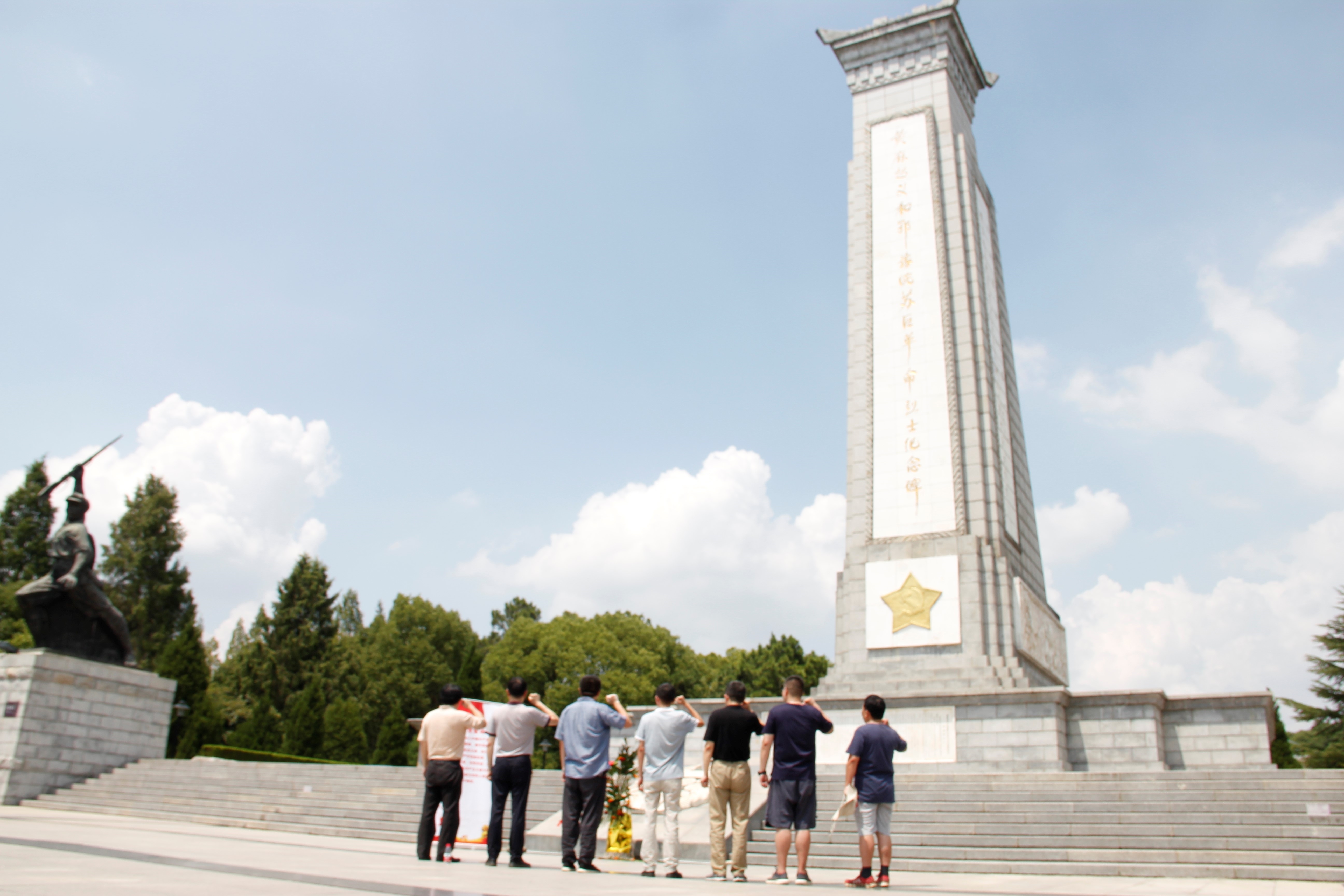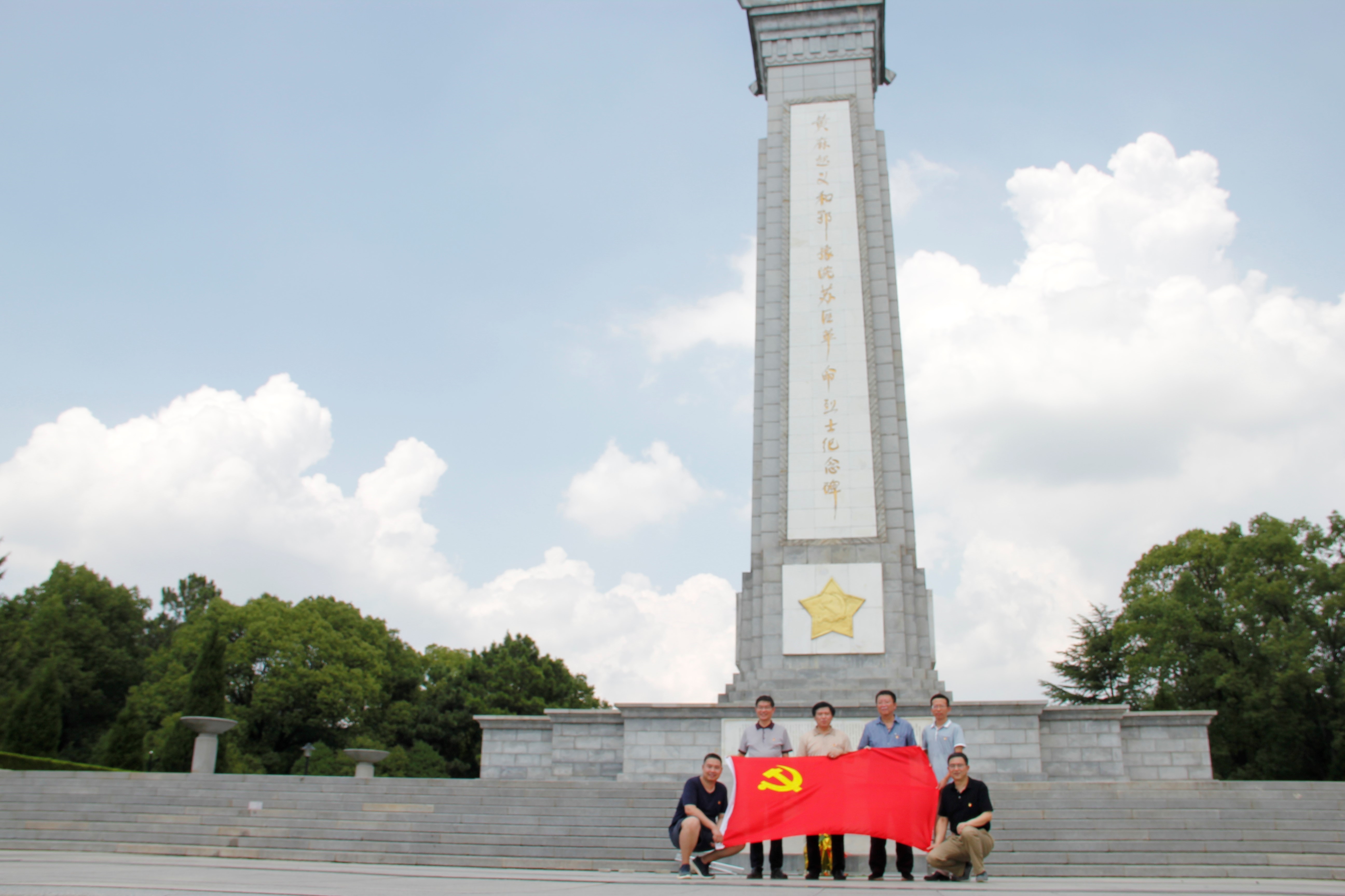 同志们在黄麻起义和鄂豫皖苏区烈士纪念碑前与党旗合影