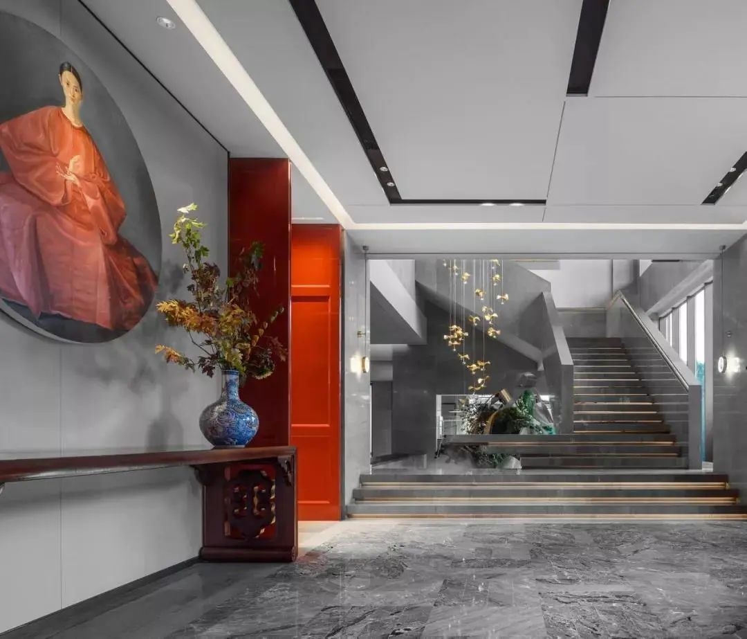 一步一景,一眼一画,随着动线从大堂进入主餐厅,中国红在餐厅晕染开来,点缀镶嵌于门上,挂画间,饰品处,在整体暖高级灰的主色调下铺以纯正的京红反而映衬出闹中取静的东方之魂。