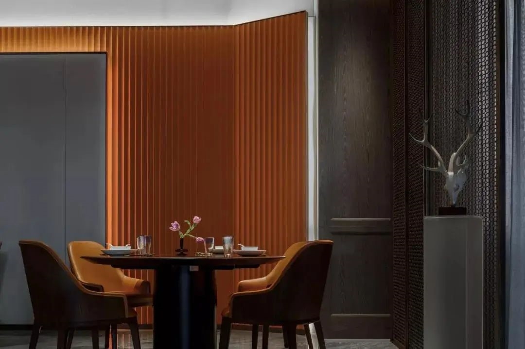 进餐之后意犹未尽来到茶室与酒吧区,一改传统古典的韵味,设计师将现代设计手法在空间中表现的淋漓尽致,大面积高级水泥灰色在空间中铺开,原木家具的搭配为来此的客人以温馨之感,贯穿整个餐厅的京红色点缀于此,呼应主题展现惊艳之处。