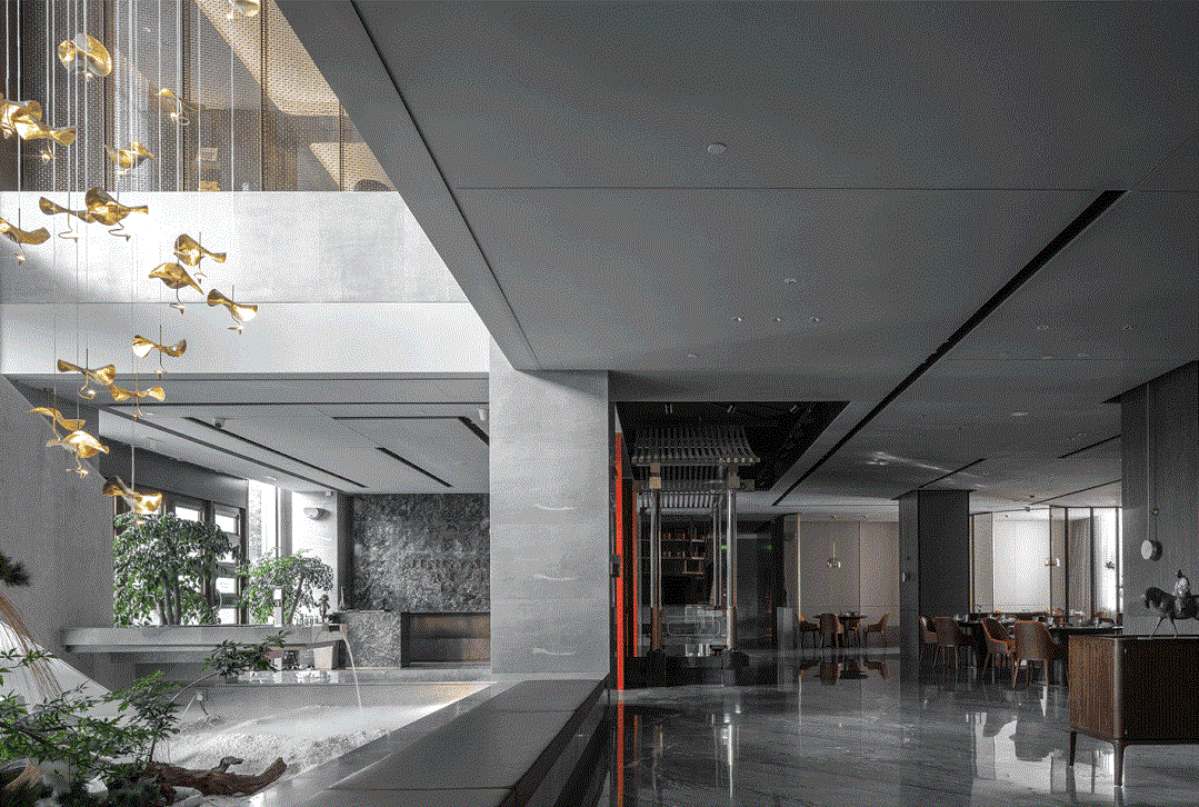 在方案设计中,为了打造功能动线的最佳空间感受以及营造一场视觉上的享受盛宴,整个餐厅由室外进入室内的动线希望以动向静的空间进行转化。入口景观的软空间过度为内部餐厅营造了一种静逸的用餐环境。