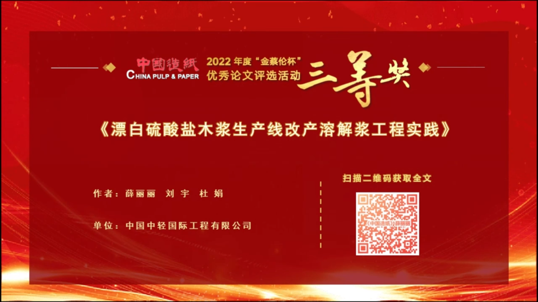 近期,best365英国体育在线所属中国中轻国际工程有限公司组织撰写的《漂白硫酸盐浆木浆生产线改产溶解浆工程实践》荣获《中国造纸》2022年度“金蔡伦杯”优秀论文三等奖。