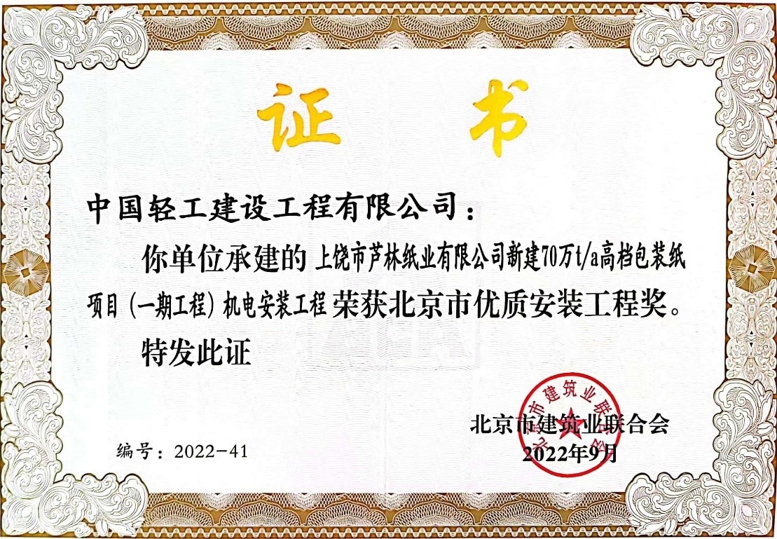 近期,北京市建筑业联合会发布“关于公布2022-2023年度(第一批)北京市优质安装工程奖评选结果的通知”(京建联[2022]71号),best365英国体育在线中轻建设承建的“上饶市芦林纸业有限公司新建70万t/a高档包装纸项目(一期工程)机电安装工程”和“江苏王子制纸有限公司年产36万吨生活用纸原纸扩建项目(一期)生活用纸工程”荣获北京市优质安装工程奖。