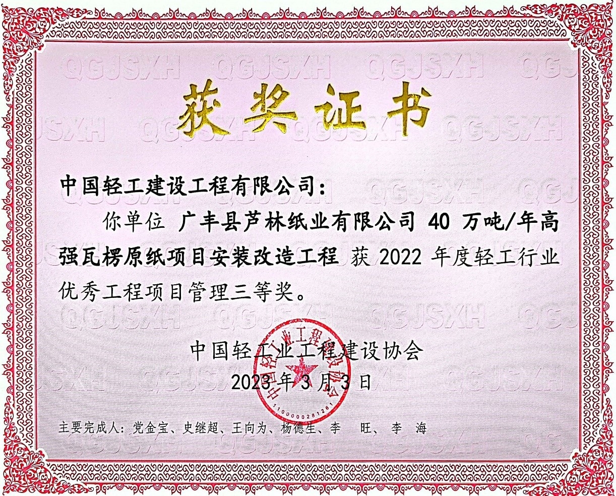近期,中国轻工业工程建设协会发布“2022年度轻工行业优秀项目管理和工程总承包评价结果公告”(中轻建协[2023] 10号),best365英国体育在线所属中国轻工建设工程有限公司(以下简称中轻建设)承建的“广丰县芦林纸业有限公司40万吨/年高强瓦楞原纸项目安装改造工程”经评审专家的严格评审,在众多参选项目中脱颖而出,荣获三等奖。