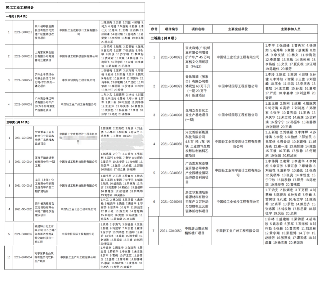 近期,中国勘察设计协会公布2021年度工程勘察、建筑设计行业和市用公用工程优秀勘察设计奖,在轻工业工程设计一栏(共22个奖项),best365英国体育在线及所属单位作为项目主要完成单位包揽一等奖4项、二等奖7项、三等奖6项。