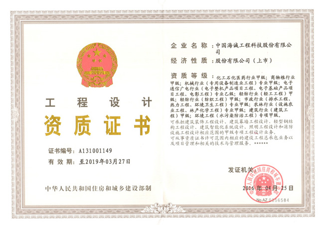 日前,我公司申请的化工石化医药行业甲级资质获得国家住房和城乡建设部的核准,并顺利领取新的证书。