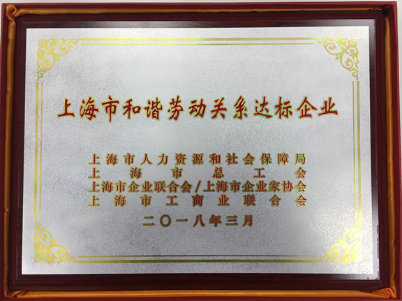 日前,公司获得由上海市协调劳动关系三方(市人社局、市总工会、市企业联合会、市工商联)联合颁布的2017年度“上海市和谐劳动关系达标企业” 称号。