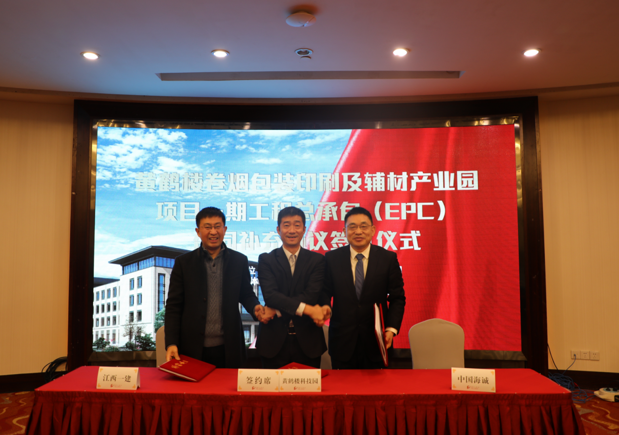 12月29日,海诚股份与黄鹤楼科技园在武汉成功签订黄鹤楼卷烟包装印刷及辅材产业园项目一期工程总承包合同补充协议。黄鹤楼科技园(集团)有限公司总经理周汉生,海诚股份党委副书记、总裁陈荣荣,江西建工第一建筑有限责任公司党委书记、董事长唐勇等出席签约仪式。