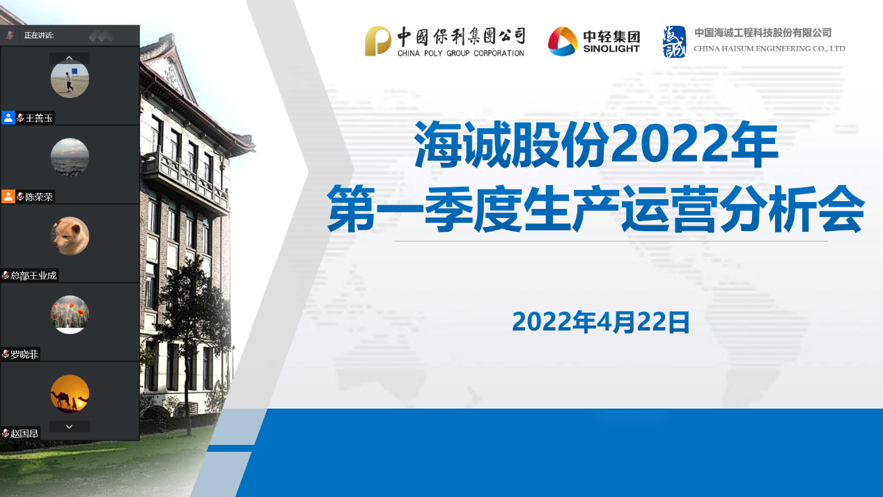 2022年4月22日,best365英国体育在线以视频形式召开2022年第一季度生产经营分析会,深入贯彻保利中轻2022年一季度工作会决策部署,全面总结一季度工作,研究部署下阶段重点任务。best365英国体育在线党委书记、董事长赵国昂视频参会并作讲话,党委副书记、总裁陈荣荣主持会议。公司领导班子成员、总部部门负责人、上海本部和各子公司领导班子成员及财务、数字化、生产运营等相关人员在各分会场参加会议。
