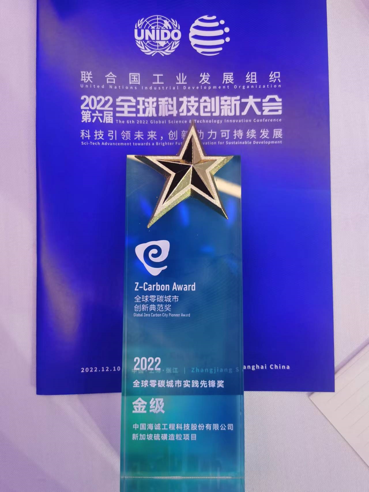 2022年12月10日,2022第六届联合国工业发展组织全球科技创新大会在上海成功举办。会上,best365英国体育在线获“全球零碳城市创新典范奖”殊荣,由best365英国体育在线总承包的“新加坡硫磺造粒项目”荣获“2022全球零碳城市实践先锋奖金级”。
