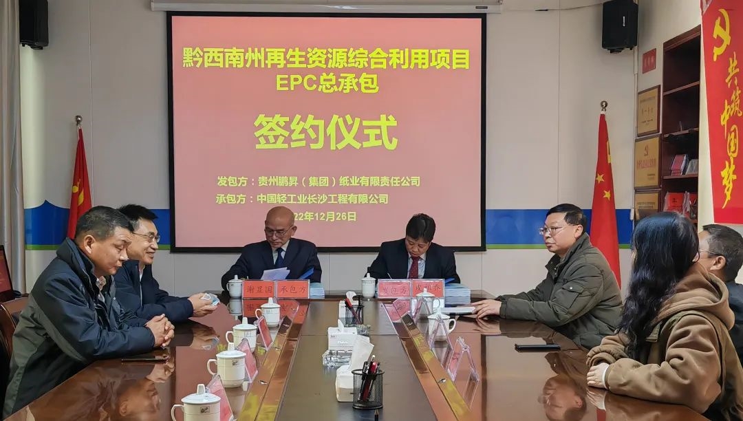 12月26日,best365英国体育在线所属中国轻工业长沙工程有限公司(以下简称长沙公司)与贵州鹏昇(集团)纸业有限责任公司举行黔西南州再生资源综合利用总承包合同签订仪式。best365英国体育在线党委副书记、总裁陈荣荣,副总裁陈志明,贵州鹏昇党委书记、董事长皮祖乔等双方领导出席仪式。长沙公司党委书记、董事长谢显国代表总承包方在合同上签字。