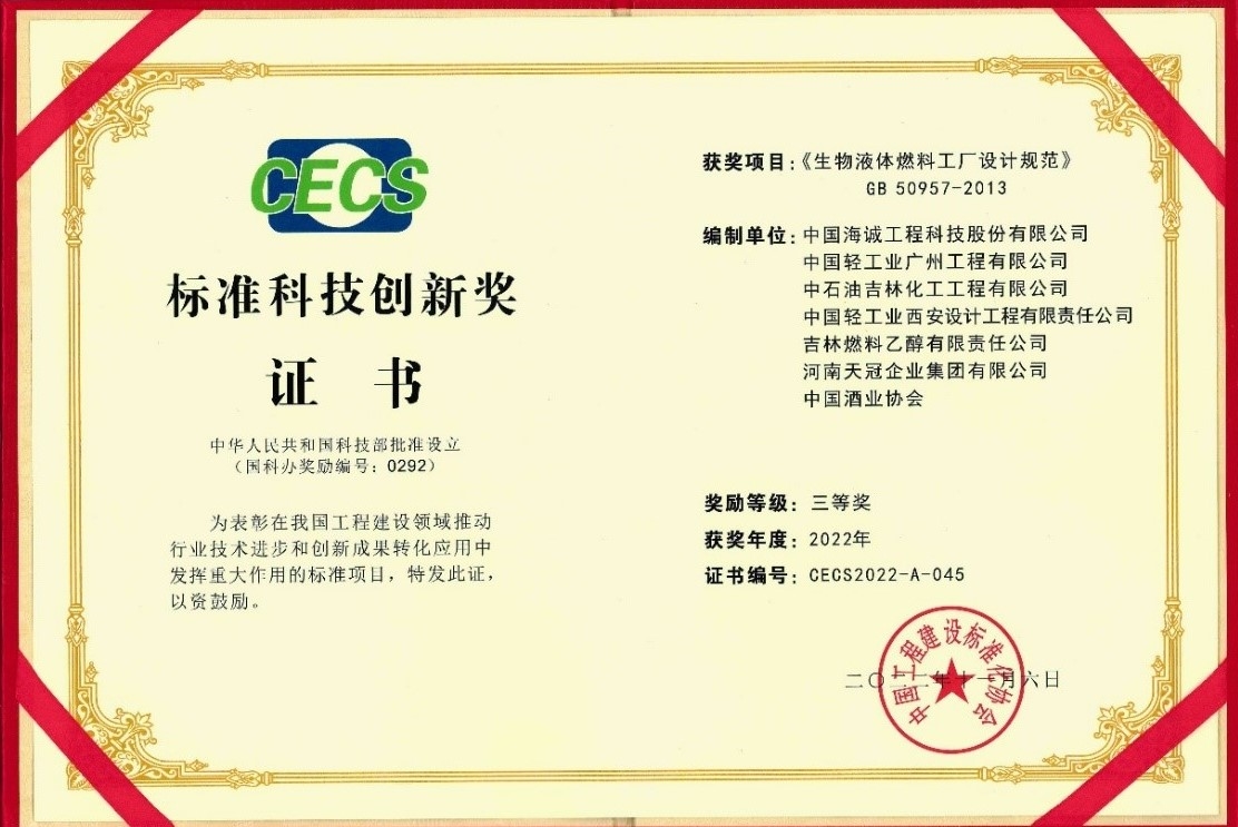 近期,2022年度标准科技创新奖颁奖典礼大会在京隆重举行。经过各方推荐申报、形式审查、专家初评、项目现场答辩、评审委员会投票和最终审定、结果公示等程序,best365英国体育在线主编的《生物液体燃料工厂设计规范》(GB 50957-2013),荣获“标准科技创新奖”项目奖三等奖。