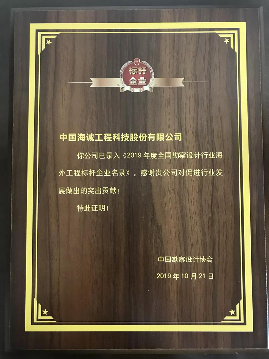 10月21日,中国勘察设计协会公布了“海外工程标杆企业”评选结果,中轻集团海诚股份入选《2019年度全国勘察设计行业海外工程标杆企业名录》,成为海外工程标杆企业。