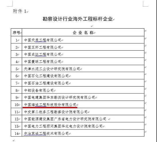 “海外工程标杆企业”是中国勘察设计协会为表彰在海外市场开拓中取得优异成绩的企业而设立,本次有14家企业入围名录,是从全国两万四千多家勘察设计单位中择优选出的。