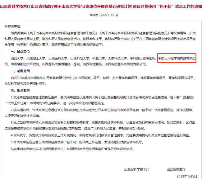 中国日用化学研究院获批成为山西省基础研究计划项目经费使用“包干制”试点单位 。中国日用化学研究院将以此为契机,加大科研投入,激发科研人员创造活力,不断提升创新能力。
