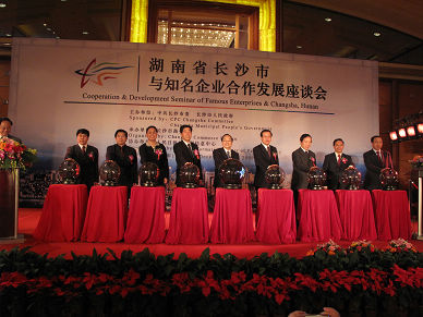 全国人大常委会原副委员长蒋正华在会上发表了讲话。他认为长沙在克服金融危机影响、实现又好又快发展上取得了令人称道的成绩,希望有实力的企业多到长沙看看,加强与长沙的交流合作,实现互利双赢。中共湖南省委常委、长沙市委书记陈润儿在会上介绍了长沙的发展成就和投资优势,表达了加强长沙与知名企业合作,实现互利共赢的良好愿望。会议由长沙市委副书记、市长张剑飞主持。