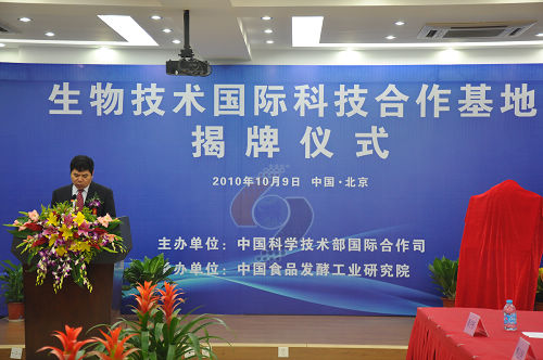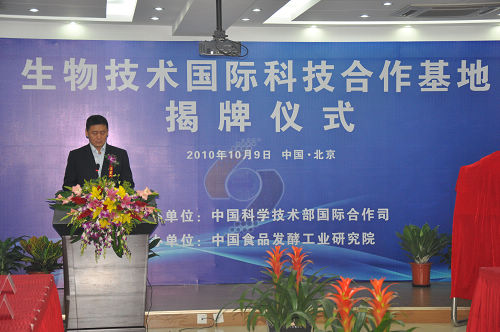 揭牌仪式上,靳晓明司长和陈鄂生董事长分别致辞。靳司长指出,科技的灵魂在于开放,食品行业作为国民经济的重要支柱产业,技术的进步离不开国际合作。希望以设立生物技术“国际科技合作基地”为契机,积极参加国际科技合作交流活动,充分利用国际资源,进一步挖掘潜力,引进高级人才,使基地真正成为“技术领先、人才聚集”的国际科技创新中心。陈董事长要求,食品发酵院要深刻领会科技部《“十一五”国际合作规划纲要》精神,紧密围绕建设创新型国家的总体目标,切实提高自主创新能力,建设“项目基地人才”一体化的国际科技研发高地。蔡院长代表基地建设单位发表讲话。