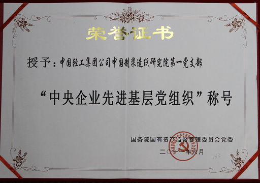 中国轻工集团公司中国制浆造纸研究院第一党支部七一前夕荣获国资委“中央企业先进基层党组织”荣誉称号。