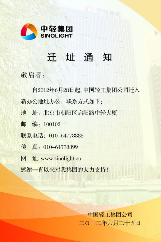 中国轻工集团公司总部迁址通知
